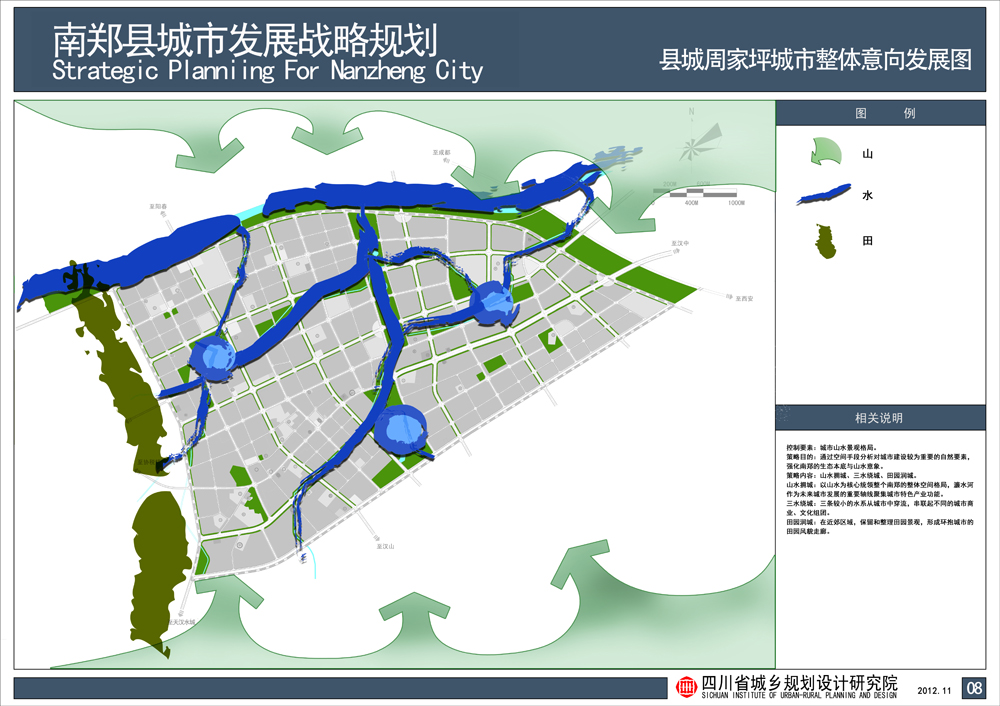 5、发展方向:东扩:向东通过汉南大道,加强与汉中中心城以及大河坎的联系与合作。北移:空间发展向濂水河方向推进,打造濂水城市新区。西优:向西与协税镇空间整合,利用场地内的水网与沟渠形成高端居住区域。南控:高起点建设天汉水城和汉山旅游景区,保护和利用景观资源要素,控制城市建设对整体山水风貌的破坏。