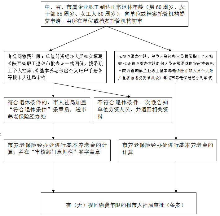 有视同缴费年限的: (1)《陕西省职工退休审批表》(4份); (2)申请办理退休人员的原始档案资料; (3)申请办理退休人员的基本养老保险个人账户手册; 无视同缴费年限的(由养老保险经办机构受理): (1)申请办理退休人员的原始档案资料; (2)申请办理退休人员的身份证复印件; (3)《无视同缴费年限参保人员正常退休申报审核表》(3份); (4)《陕西省城镇企业职工基本养老保险在职人员个人账户重要信息变更审批表》(注:此表为拟退休人员申报信息与数据库不符需要变更时填写); (5)养老保险经办机构要求提供的其它证明材料。 |